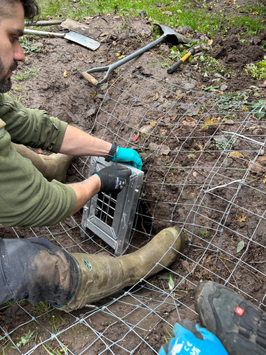 After obtaining approval, we implemented a targeted badger-proofing system. We installed one-way badger gates at each of the nine tunnel entrances. These gates allowed the badgers to exit freely but prevented re-entry. To reinforce the area, we lined it with high-quality stainless steel mesh, which offered a durable and effective barrier against digging.
